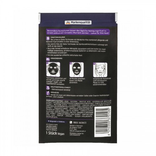 The black Balea cloth mask with activated carbon fleece combines nourishing and clarifying properties in one application.